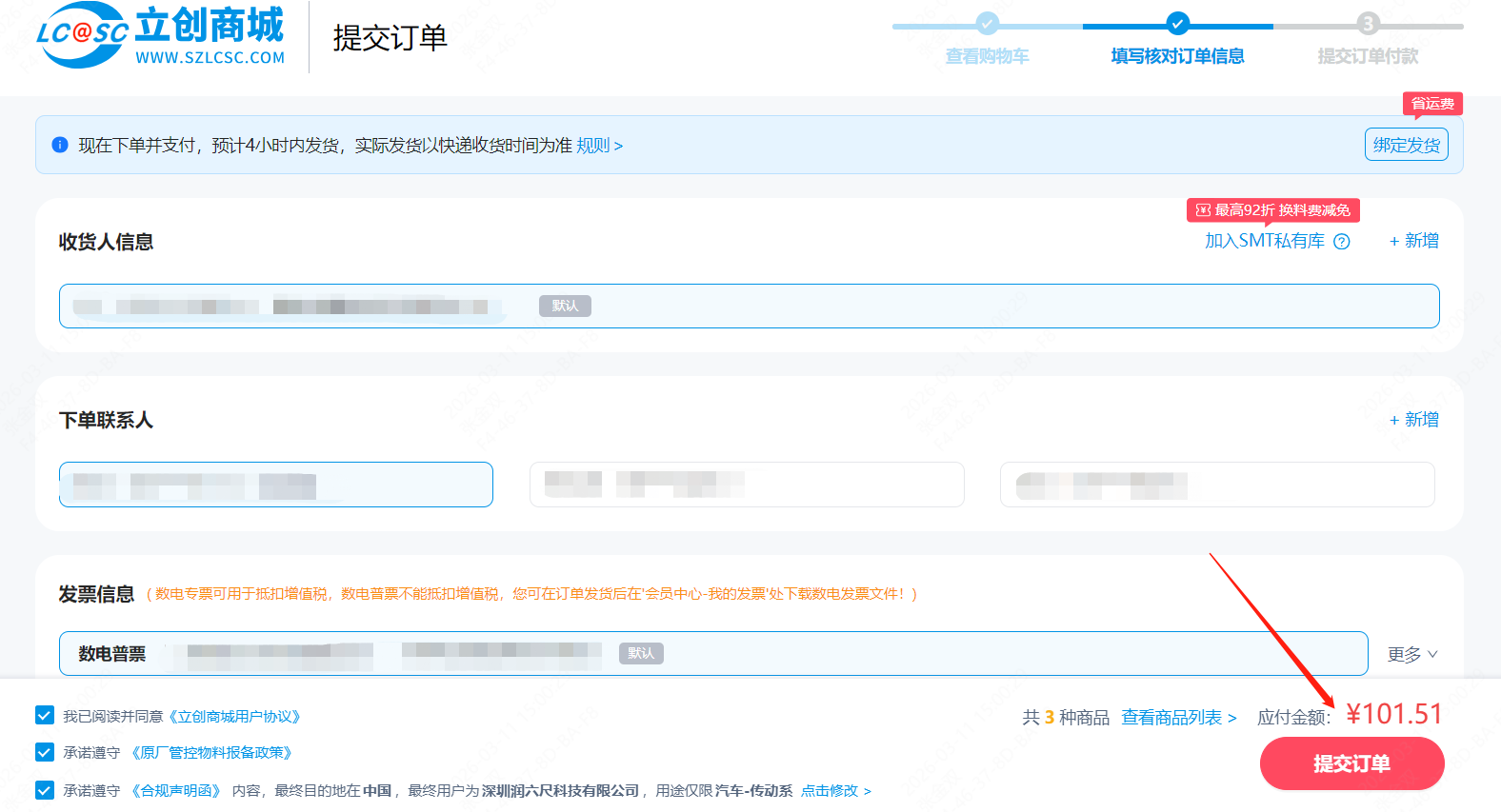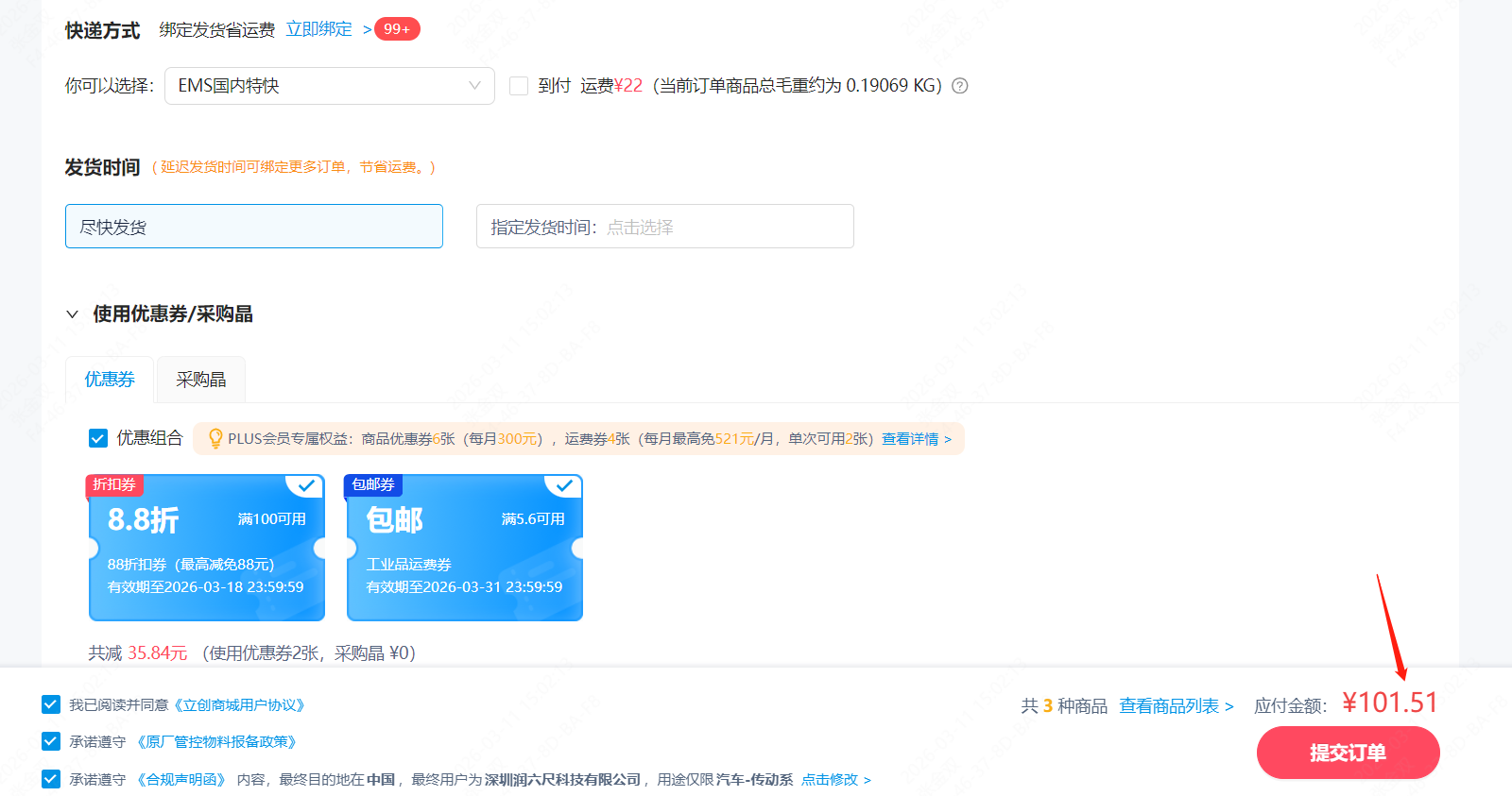 4.选择快递方式,优惠券,勾选用户协议,点击”提交订单“