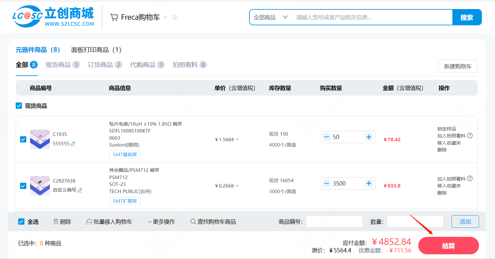 2.查看购物车,确认需要购买的商品数量后,点击”结算“