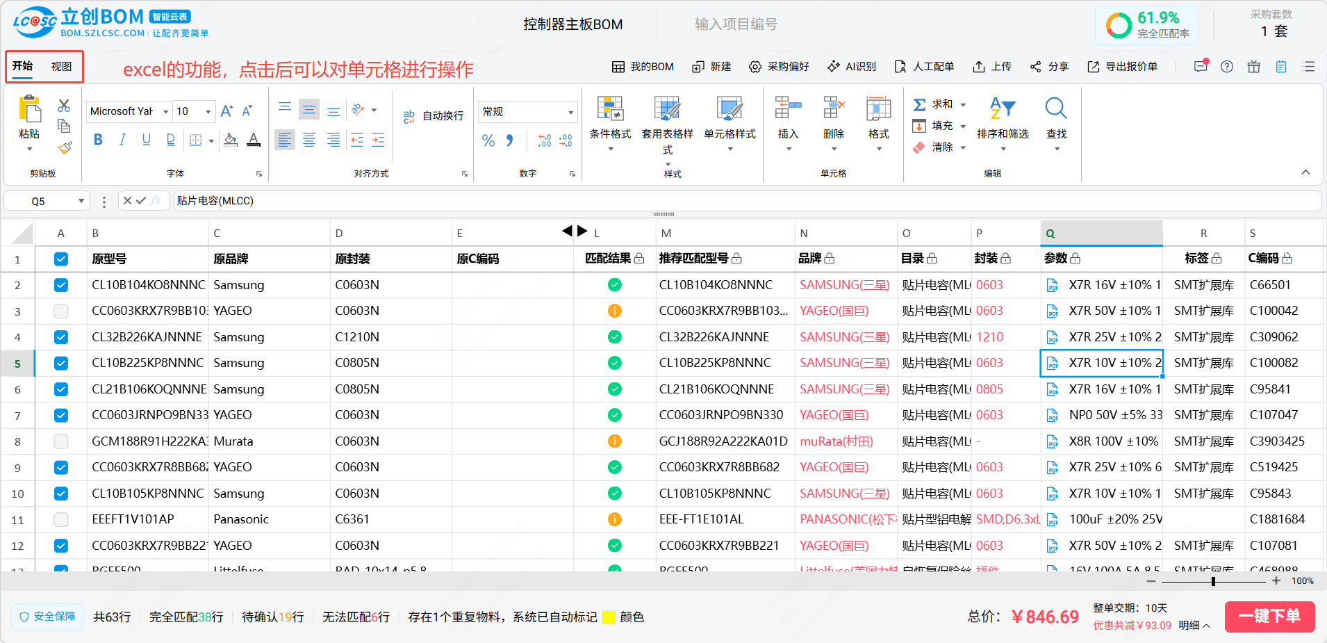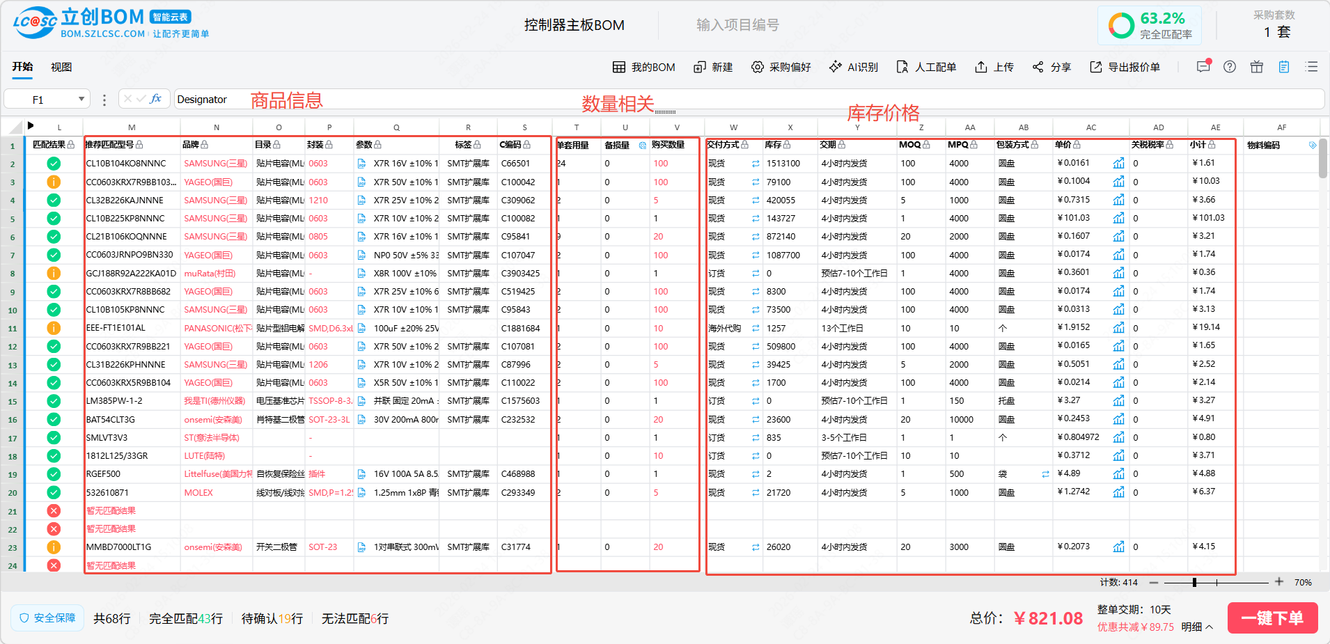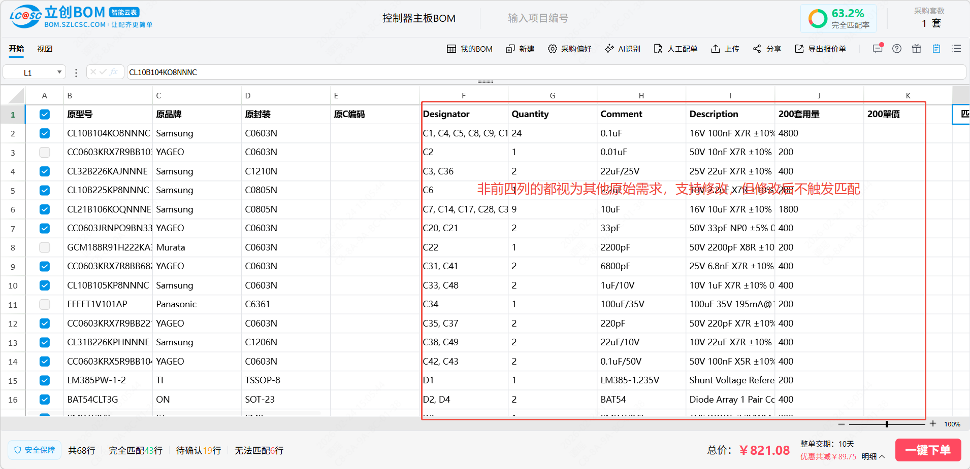 立创BOM智能云表专为电子元件BOM管理和下单设计,支持批量上传和购买,能有效的提升用户下单的效率,同时BOM智能云表以excel体验为核心,让用户在立创BOM中也能像使用excel一样操作和编辑,减少用户学习成本,给用户提供一个方便好用的BOM工具