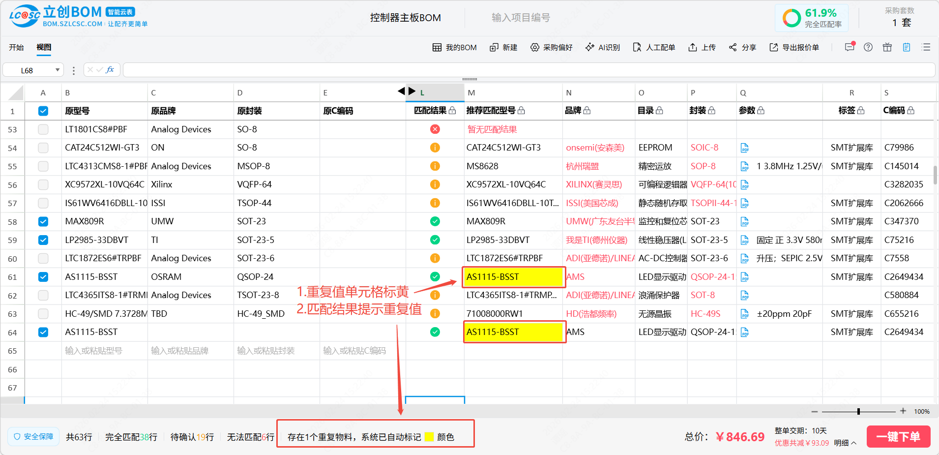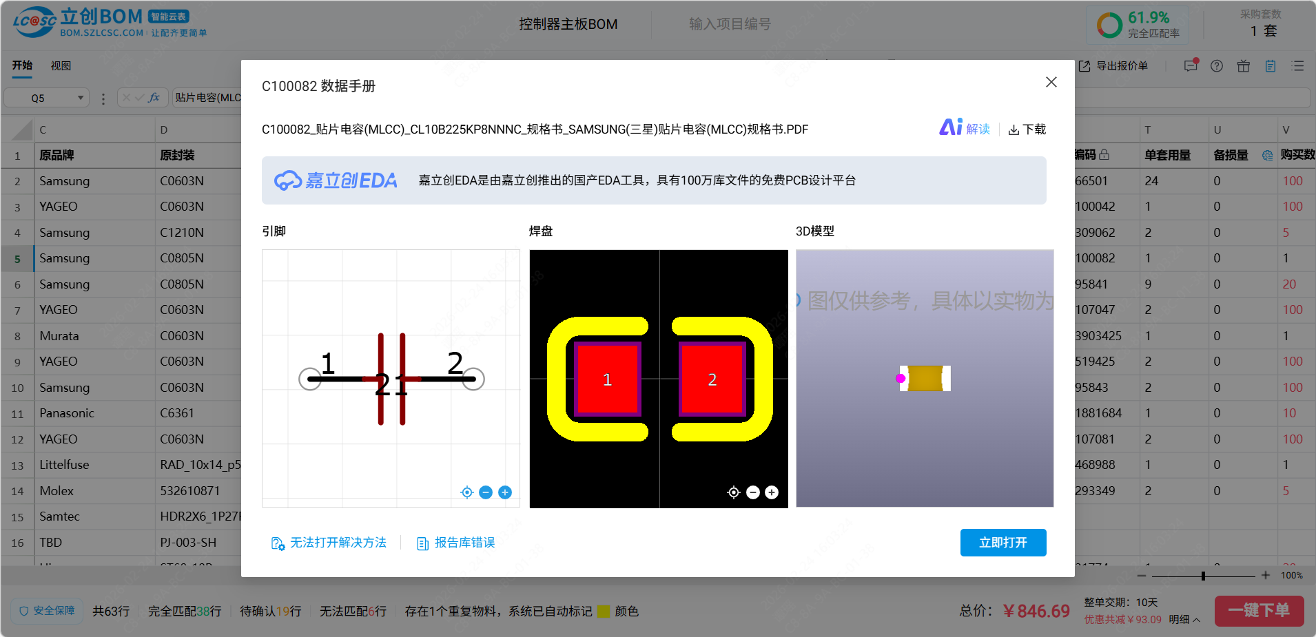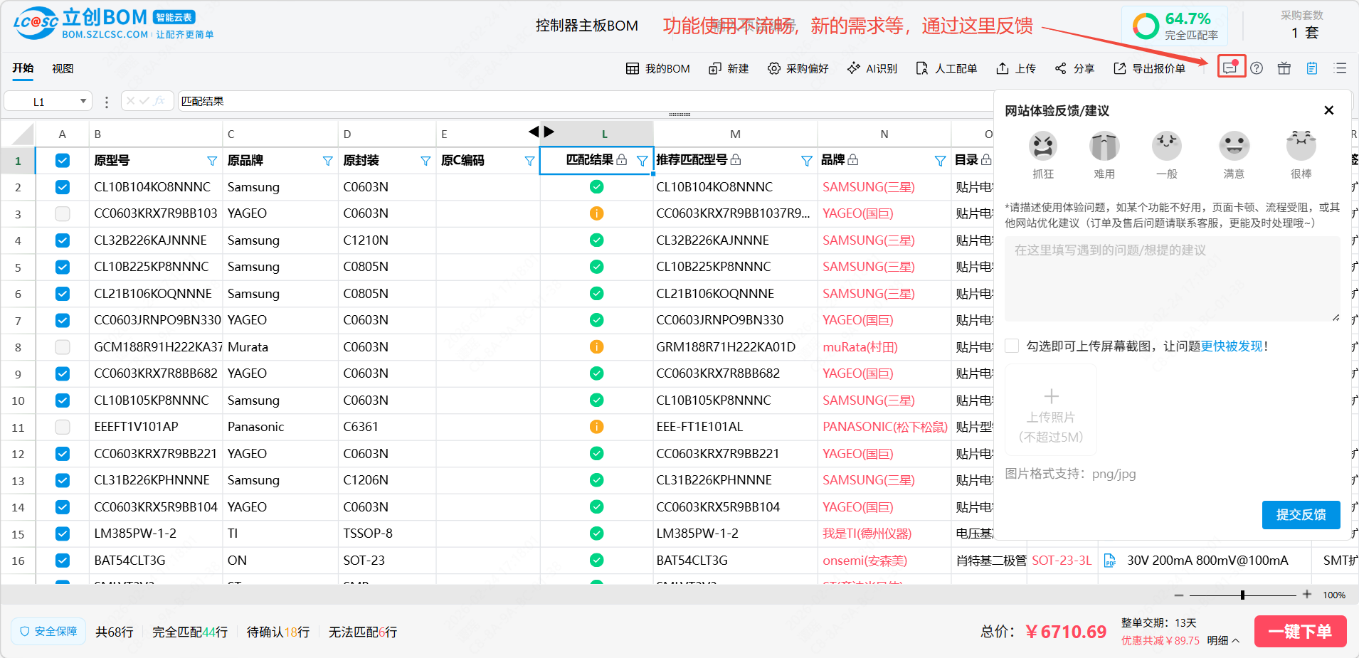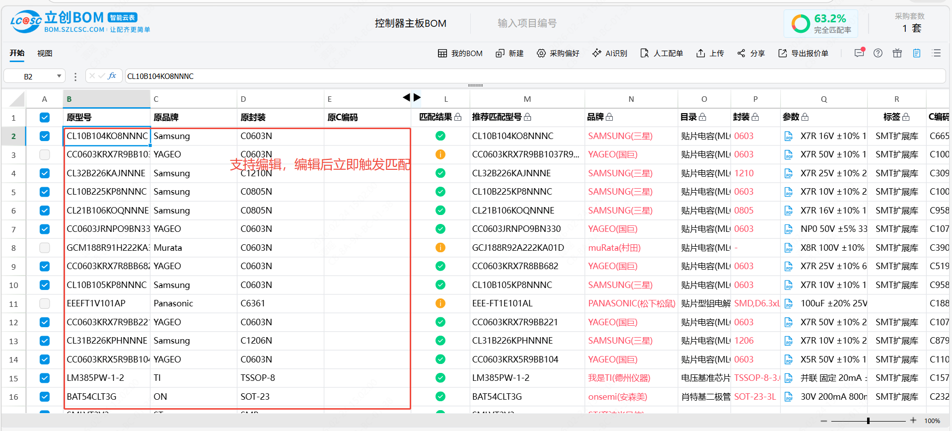 立创BOM智能云表专为电子元件BOM管理和下单设计,支持批量上传和购买,能有效的提升用户下单的效率,同时BOM智能云表以excel体验为核心,让用户在立创BOM中也能像使用excel一样操作和编辑,减少用户学习成本,给用户提供一个方便好用的BOM工具