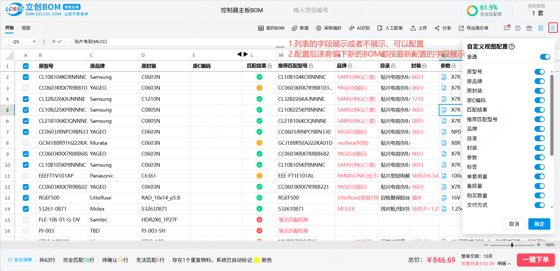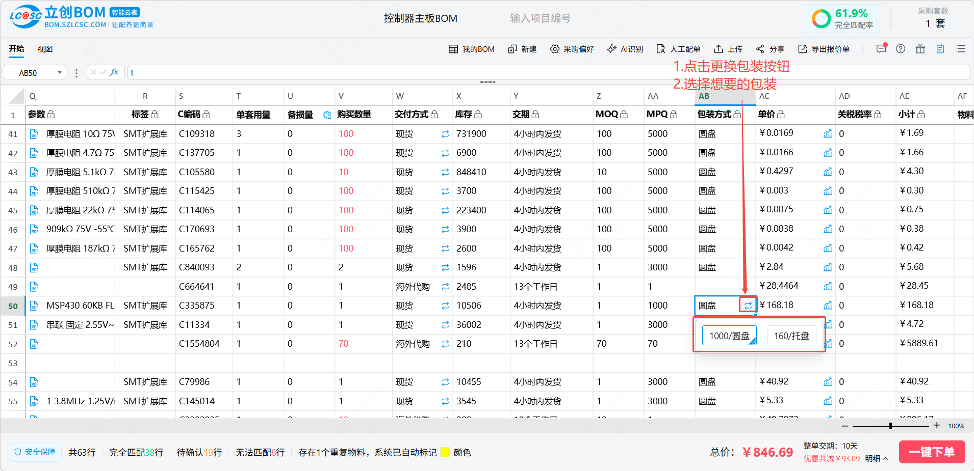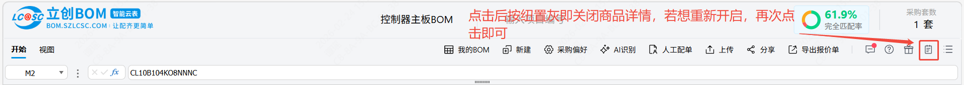 系统匹配的内容即为匹配结果区域,即系统根据用户的原始需求匹配对应立创商城的商品,该商品的相关信息和价格库存的展示,该部分内容中只有:匹配结果,单套用量,备损量,购买数量,交付方式,包装方式和物料编码支持用户修改,其余信息均不支持用户修改