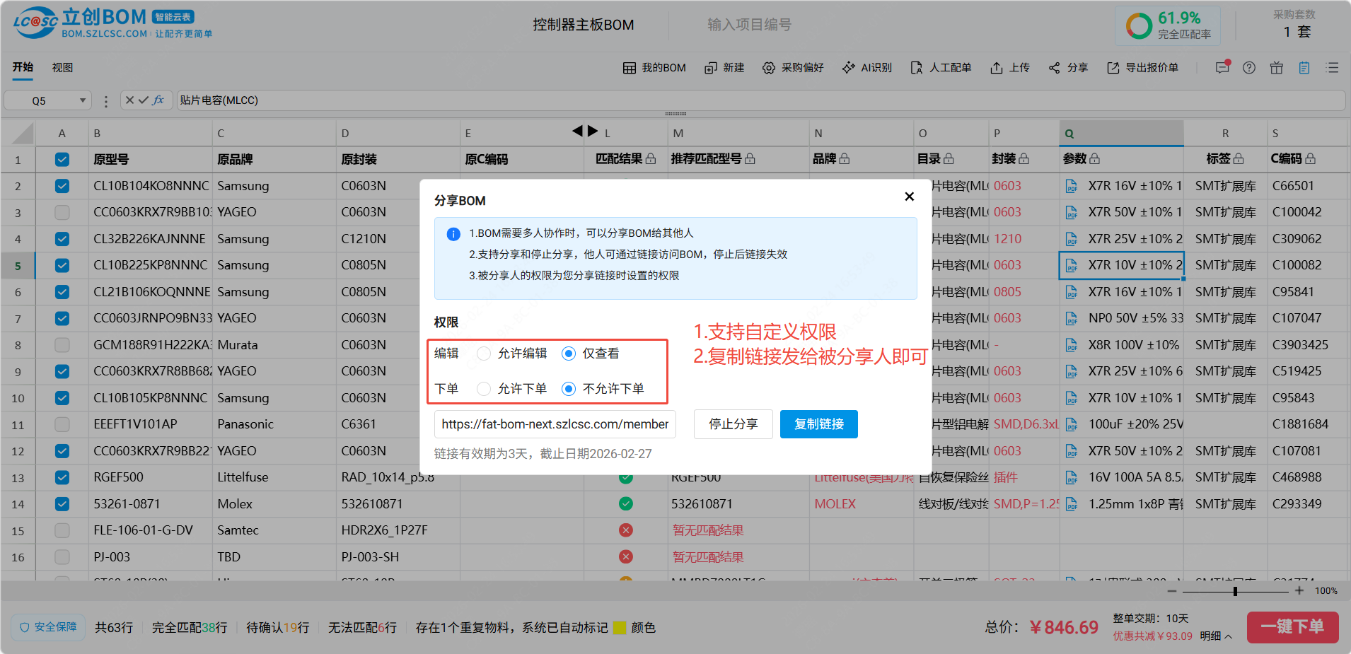 分享功能适用于团队协作,如采购把BOM分享给工程师,工程师可以确认或者修改需求信息,分享功能有权限设置,用户可以根据被分享人的身份,自行设置分享权限