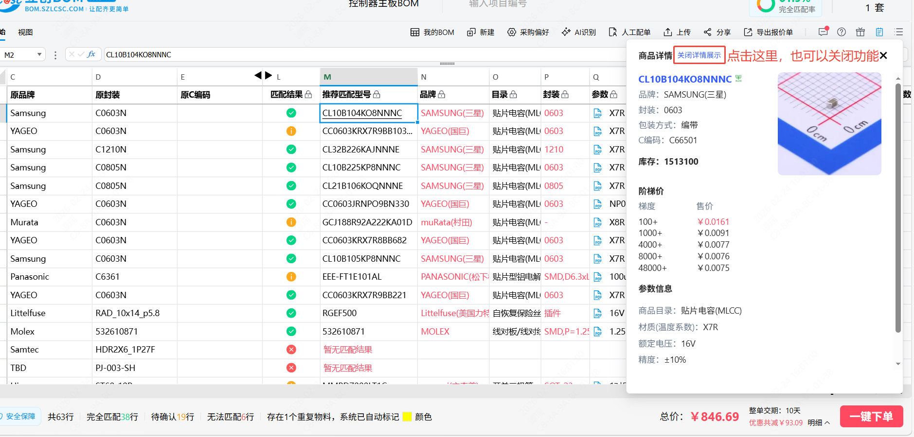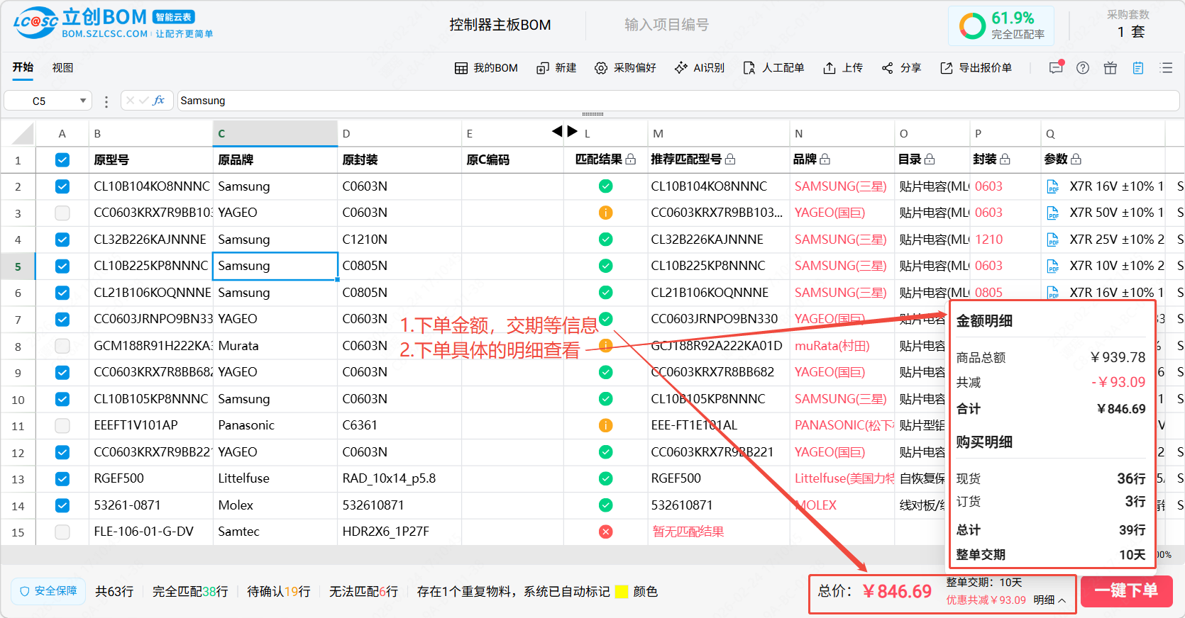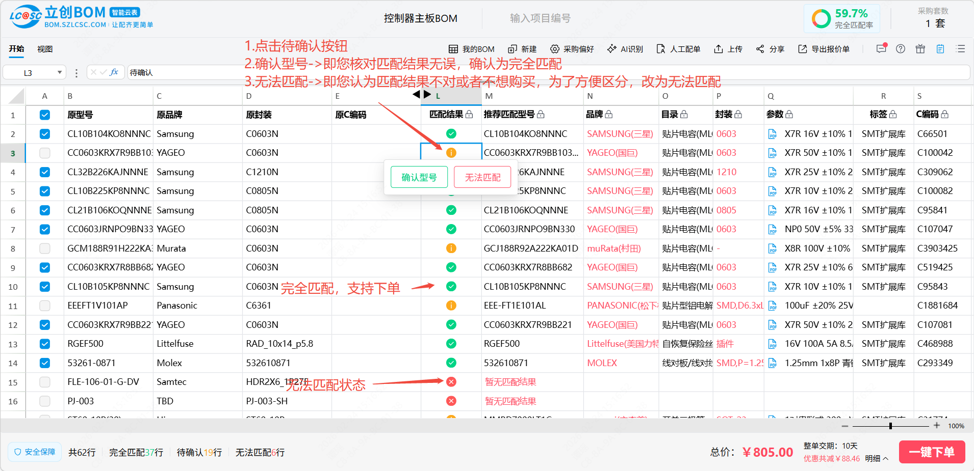 整体的使用流程为:上传/新建BOM->核对匹配结果->确认无误并下单