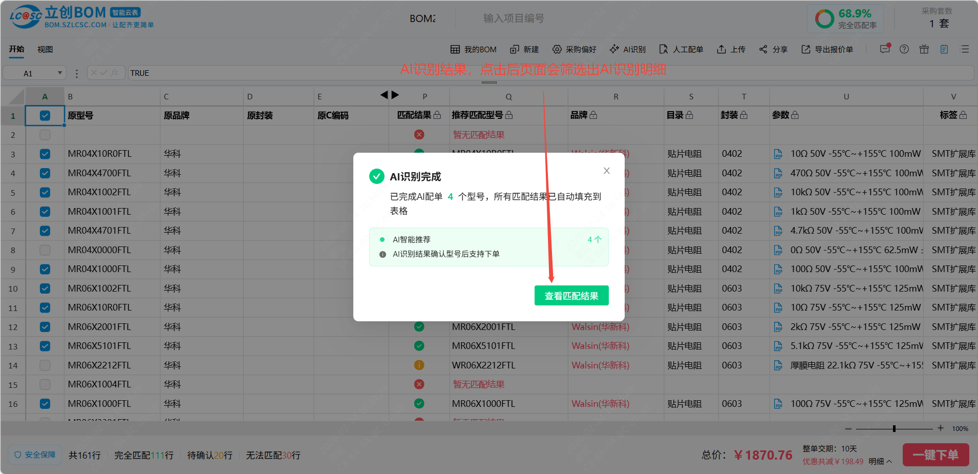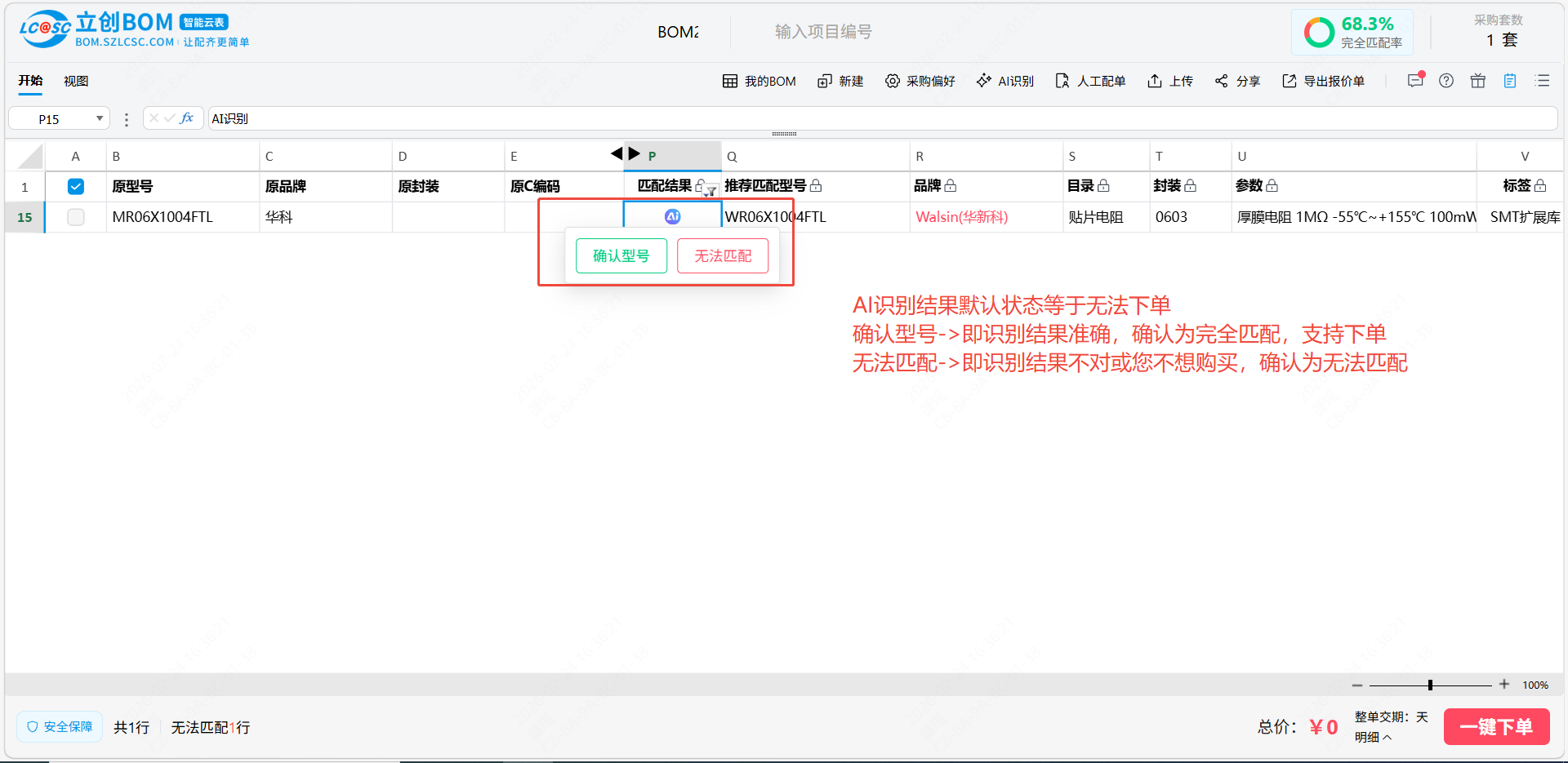 AI识别仅针对匹配结果为无法匹配的物料,点击后系统将结合AI重新识别并匹配,匹配结果会标记为AI,用户可以对AI识别的结果进行确认
