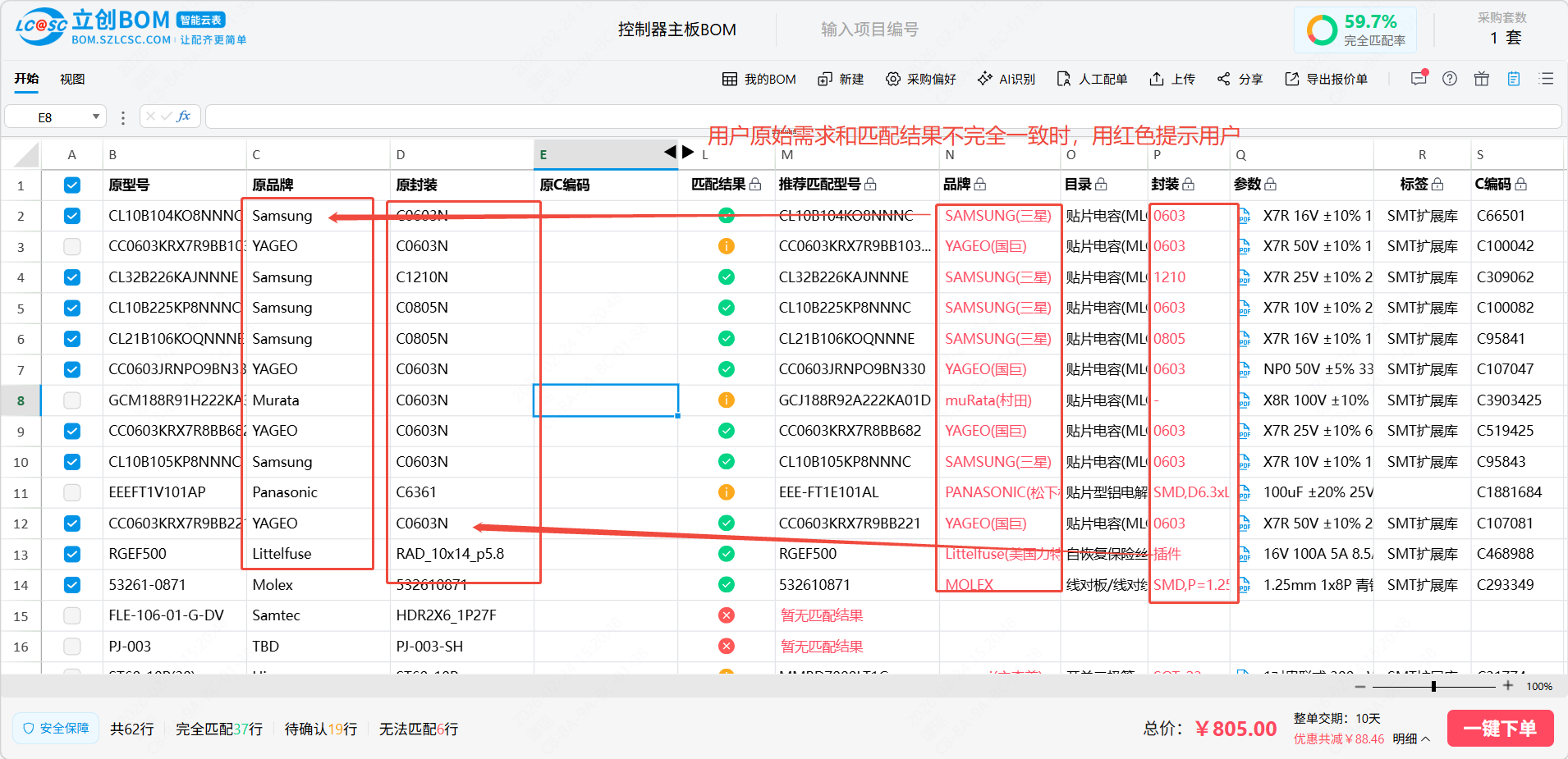 匹配结果异常提示:若匹配结果(品牌和封装)和用户原始需求不一致,则系统会用红色字体展示