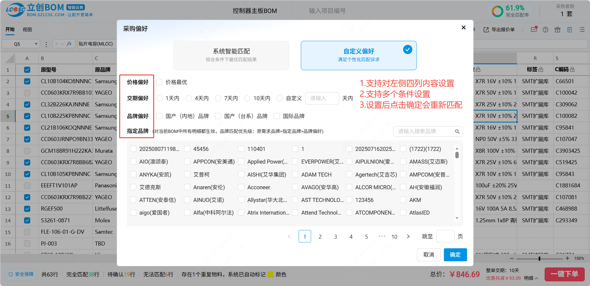 用户上传BOM后,系统默认按智能推荐模式进行匹配,若用户对匹配结果有要求,如对价格,交期或品牌有要求,则可以通过采购偏好功能进行设置,设置后系统会根据用户设置内容再次匹配