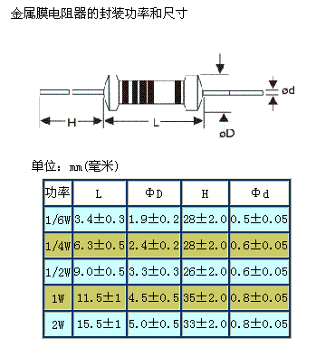 金属膜电阻的功率可以根据电阻本身的尺寸来判读,如图: