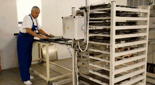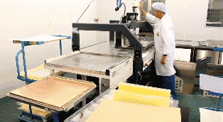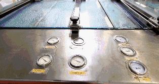 将被铁板夹住的PCB板子们放置到支架上,然后送入真空热压机中进行层压。真空热压机里的高温可以融化半固化片里的环氧树脂,在压力下将芯板们和铜箔们固定在一起。
