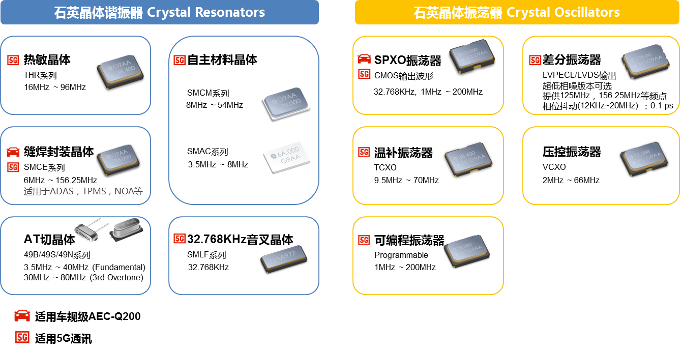 应达利能提供各种封装尺寸规格的石英晶体谐振器。包括传统有引线金属封装、缝焊式封装、环氧树脂封装以及复合式封装。SMD谐振器产品尺寸由1.2mm x 1.0mm至7.0mm x 5.0mm,可提供频率范围由32.768kHz至156.25MHz,并提供不同精度规格以满足不同客户应用需求。