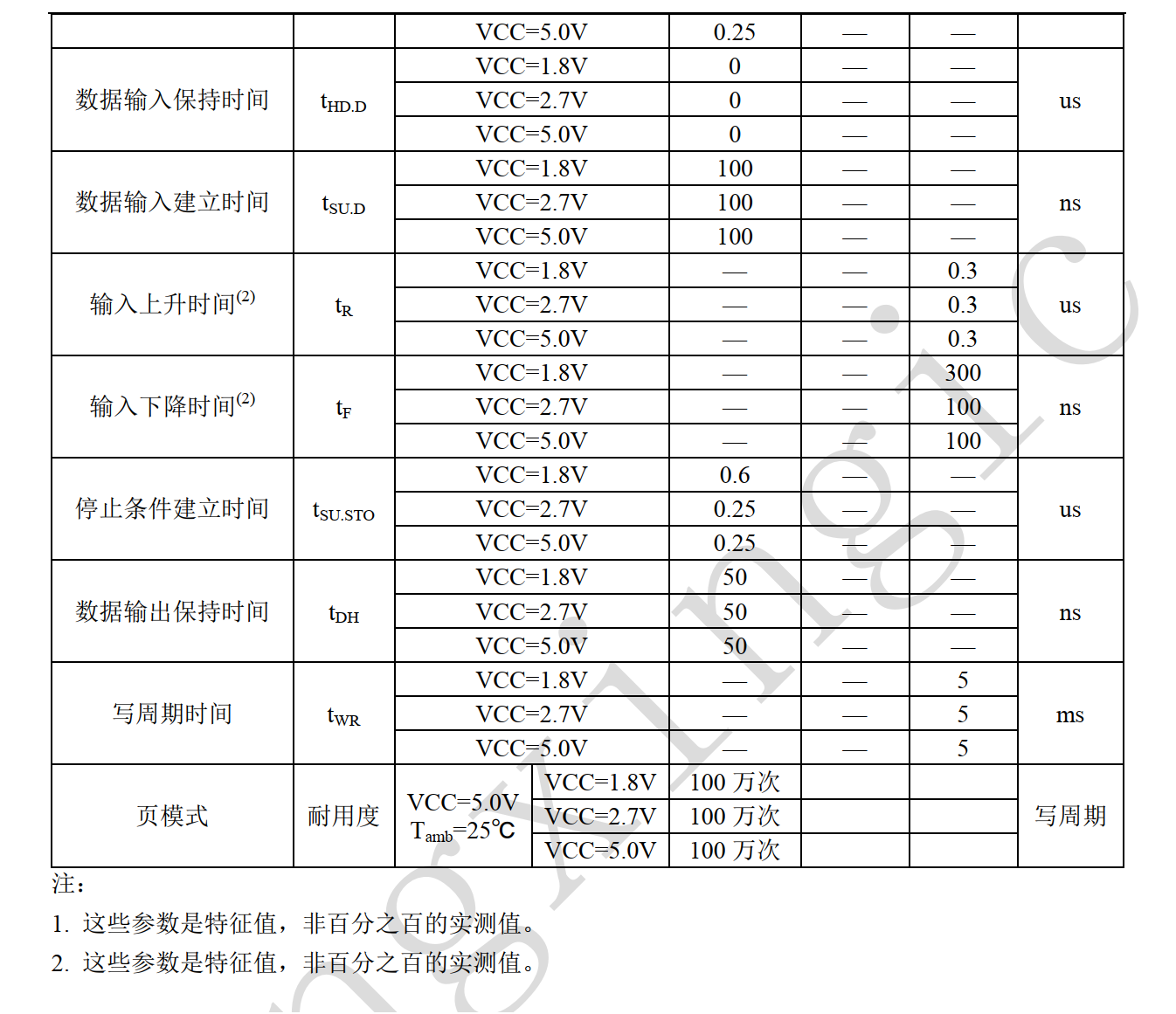 交流参数:时钟频率依 VCC 不同可达 400kHz 1000kHz,时钟脉冲宽度、噪声抑制时间、数据输入输出与总线操作相关时间、写周期时间等时序参数详细规定,确保与微处理器等外部器件在时序上精准配合,实现高效数据传输与存储操作。