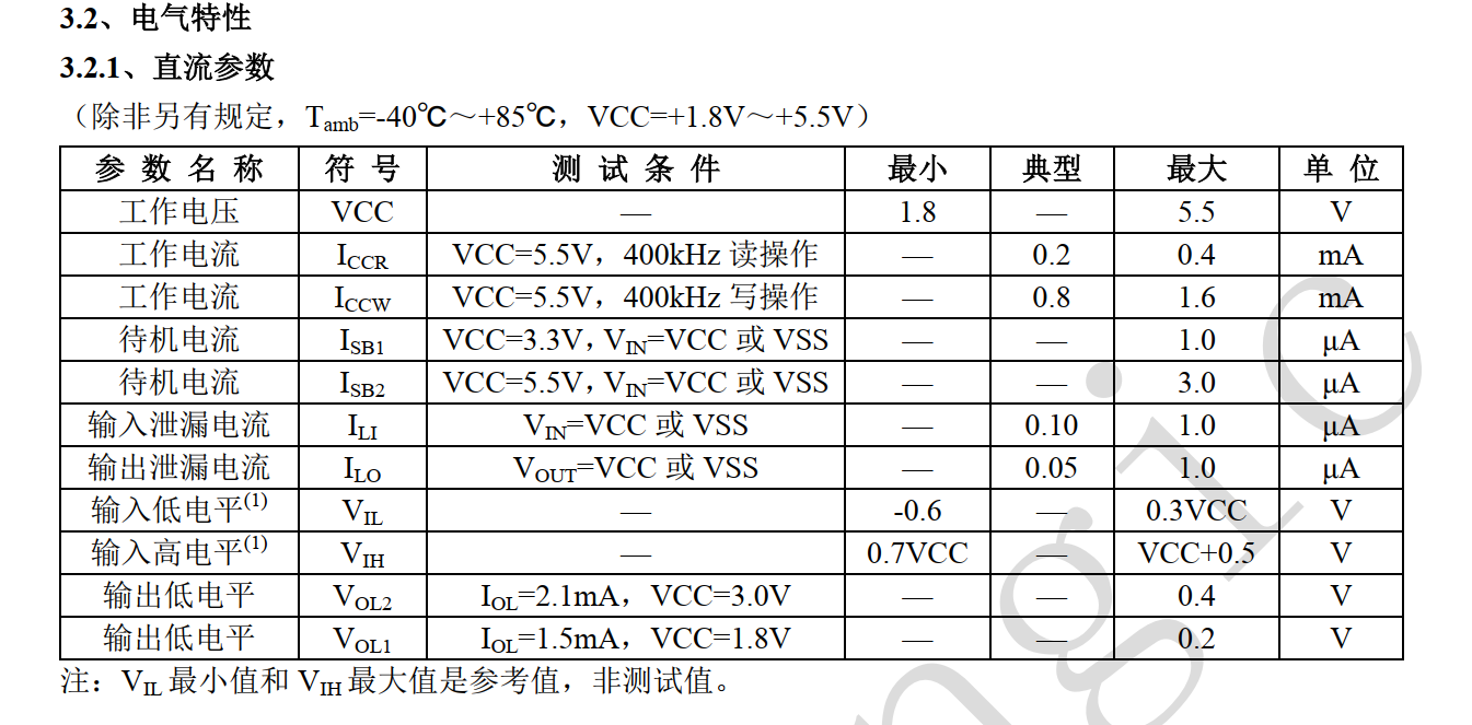 直流参数:工作电压 1.8 5.5V,不同电压下工作电流(读/写)、待机电流、输入输出泄漏电流、输入输出电平及输出低电平(不同负载)等参数明确,为电路设计提供精确参考,有助于合理选型与设计供电及外围电路。