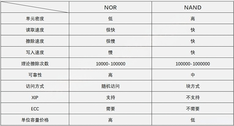 3、NOR 与 NAND 写入前都需要先擦除,NOR在擦除时以64~128KB的块进行,执行一个写入/擦除操作的时间约5s,NAND在擦除时以8~32KB的块进行,执行一个写入/擦除操作的时间约4ms。
