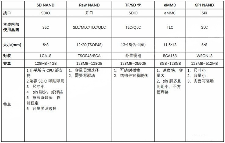 芯片类产品有SD NAND,eMMC, SPI NAND. 他们共同特点是内部都带了针对NAND Flash的管理机制。相对来说可以减轻CPU的负荷。但SPI NAND除外,它内部只带了部分管理算法,因此还是需要写驱动。 模组类产品主流的有TF/SD卡,SSD,U盘等。