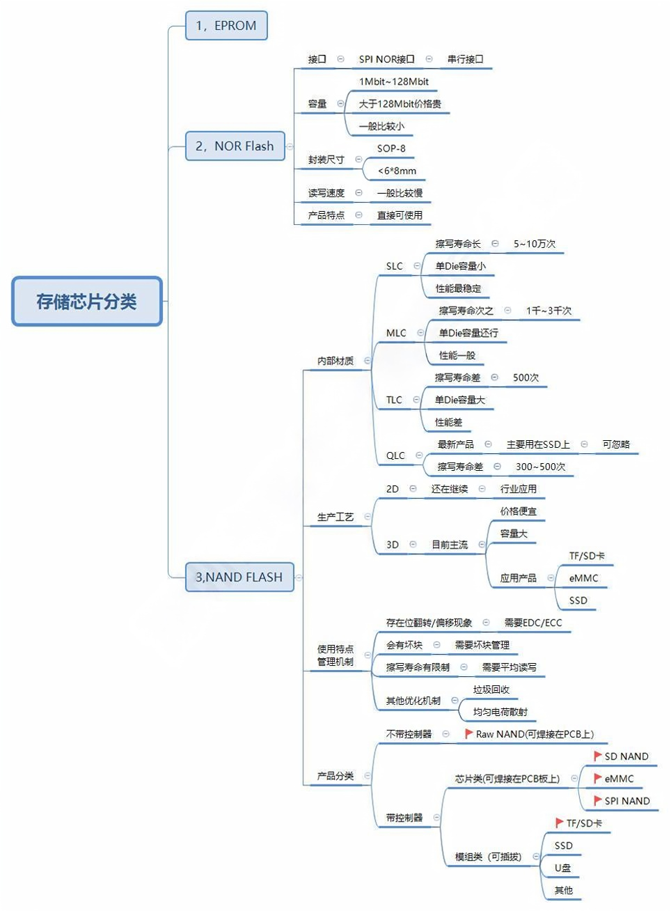 我们把存储产品大概分为E2PROM,NOR,NAND 3类,他们框架如下:(下图来自雷龙公司博客)