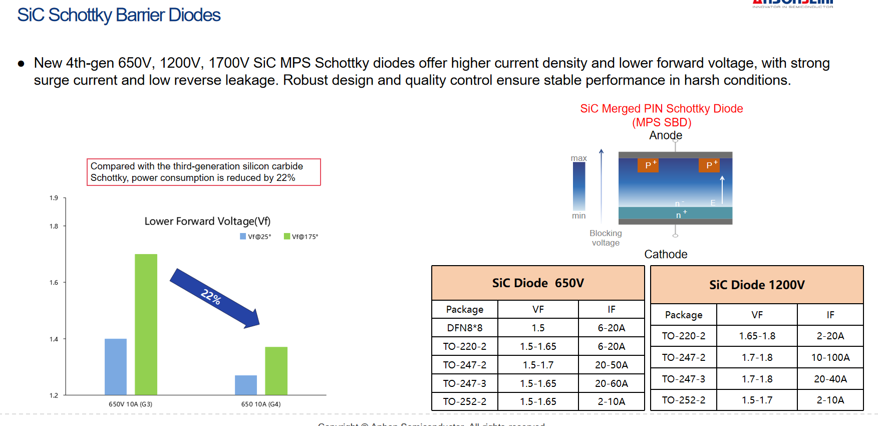 在碳化硅器件的产业化浪潮中,我们始终以技术突破回应市场需求。旗下第四代碳化硅 MPS 肖特基二极管(涵盖 650V、1200V、1700V 电压等级),正是碳化硅材料优势的典型载体 —— 通过先进薄片技术提升电流密度、降低导通损耗,结合抗浪涌技术增强工况适应性,为各领域客户提供兼具高效与可靠的功率解决方案。