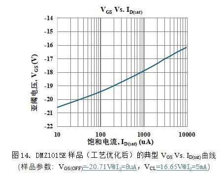根据耗尽型MOSFET的亚阈特性可知,此时VGS电压满足:0V<|VGS|<|VGS(OFF)|,并且VGS电压与可通过DMZ1015E/DMX1015E的最大电流ID(sat)有唯一对应关系。