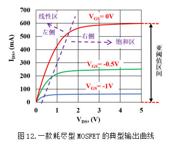 图12所示为一款耗尽型MOSFET的典型输出特性曲线,可以看到,随VDS的增加,当VDS>VGS−VGS(OFF)(VGS(OFF)为负值)时,MOSFET工作在饱和区,此时流过MOSFET的电流达到最大值(结温一定,忽略沟道长度调制效应)。当亚阈电压VGS确定时,MOSFET可以通过的最大电流(ID(sat))也唯一确定。