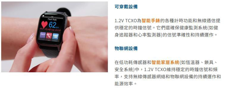 1.2V TCXO 确保蓝牙系统(如健身追踪器和心率监测器)的设备精确度和持续运 作。它们还为物联网应用中广泛使用的各种低功耗无线设备提供频率稳定性。