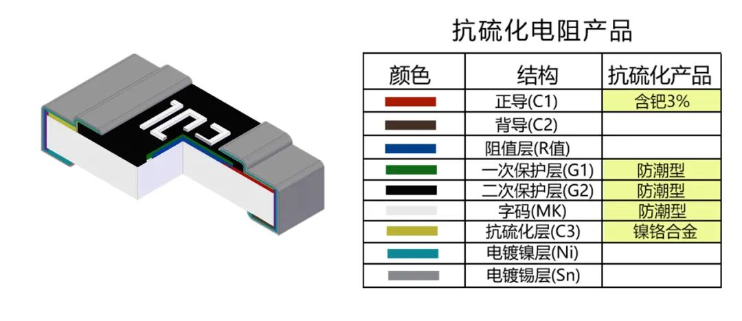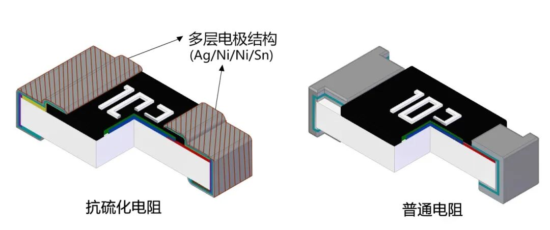 抗硫化电阻采用多层电极结构,如NiCr/Ni或Ni/Pd/Ag等,避免银直接暴露,有效阻隔含硫气体(如H₂S、SO₂等)侵蚀,防止硫化银在内部生成,导致电阻失效。