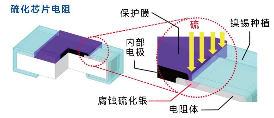 电子产品在高温,高湿,高污染等硫气浓度高之环境下,会产生各种硫化合物散布到空气中,而这些硫化合物会吸附在金属表面上,慢慢地造成金属硫化。通常电阻器等电子元件会使用银,但若长时间接触硫化物,将可能因为电极部硫化造成电阻值异常,进而降低产品可靠度。