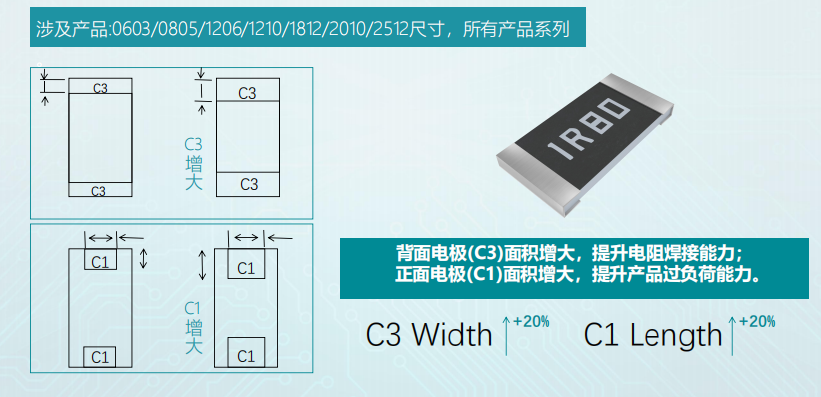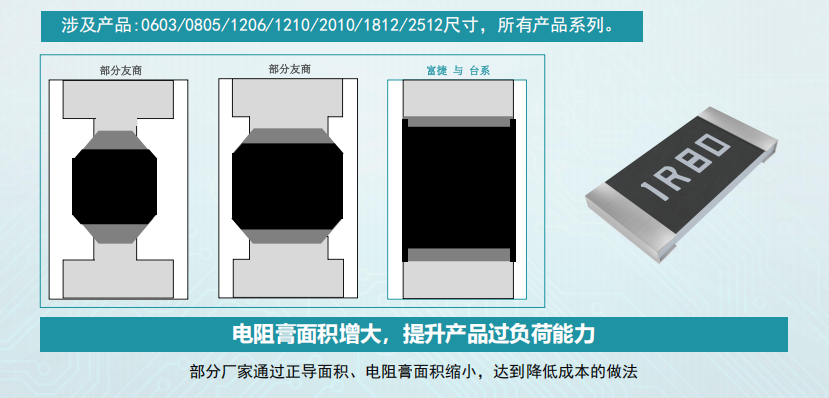 在结构设计上:通过增大电极和电阻膏面积,显著提升了产品的焊接能力和过负荷能力;
