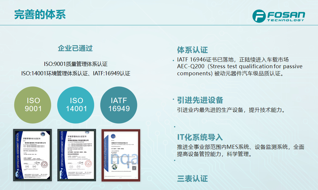 富捷科技通过了ISO9001质量管理体系认证、ISO14001环境管理体系认证和IATF16949汽车体系认证,这标志着其在质量管理、环境保护和汽车电子领域的专业能力得到了国际认可。此外,富捷科技还建立了AECQ200车规实验室,专门用于汽车级电阻的检测和认证,进一步提升了其在汽车电子市场的竞争力。