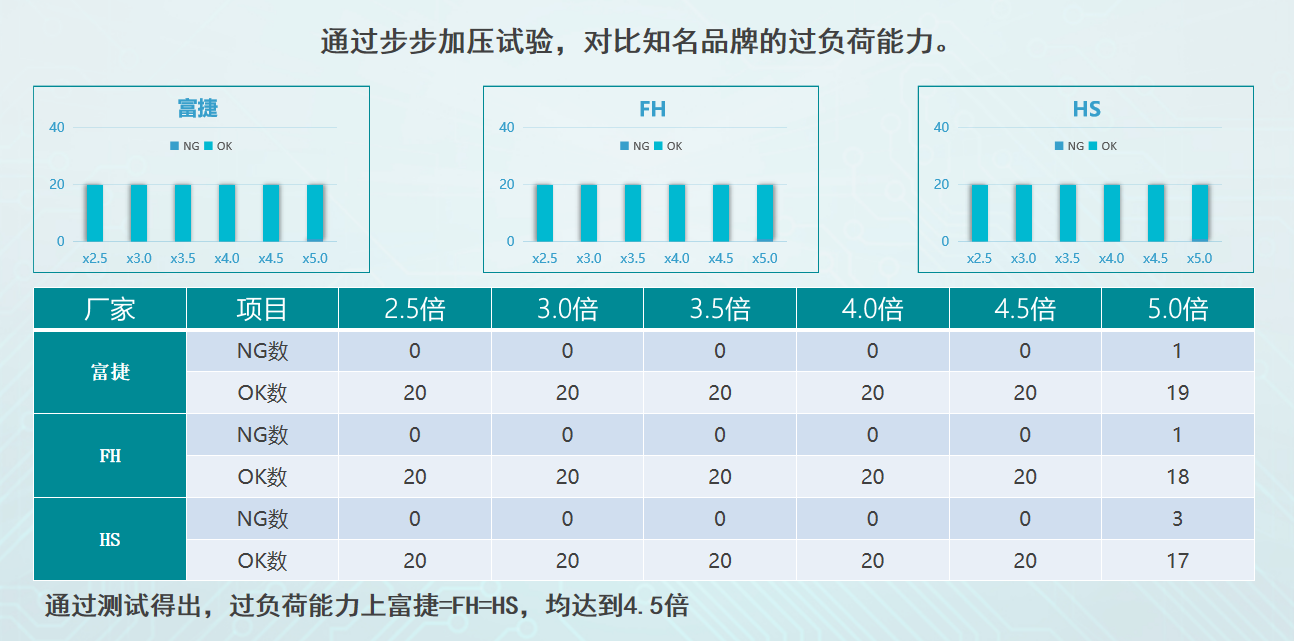 在同业对比中:富捷电阻在过负荷能力上与知名品牌相当,完全能够满足高负荷应用场景的需求;