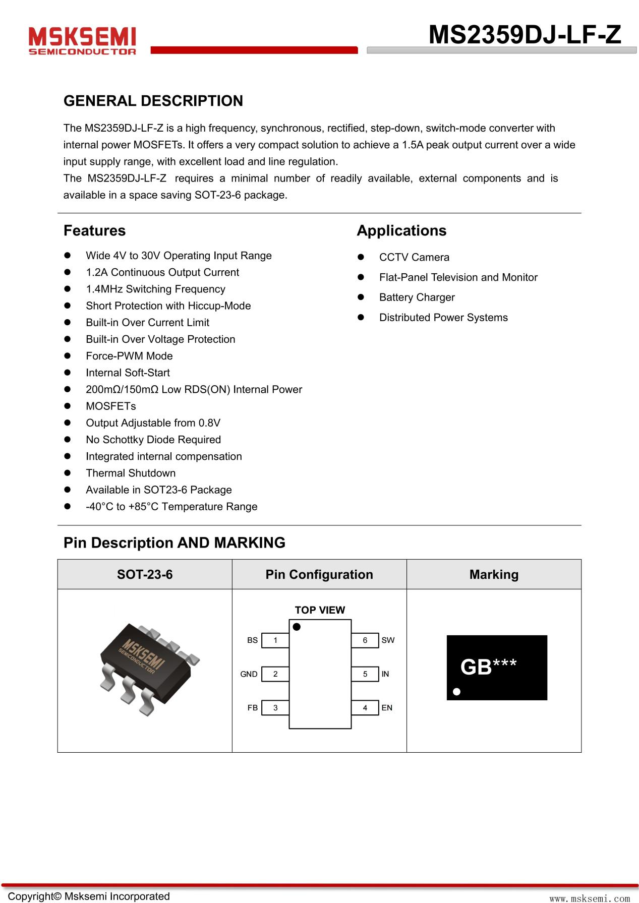 MS2359DJ-LF-Z 支持 4V 至 30V 的输入电压范围,其在低压启动与高压耐受方面更具优势,适用于输入电压波动较大的工业与车载环境。