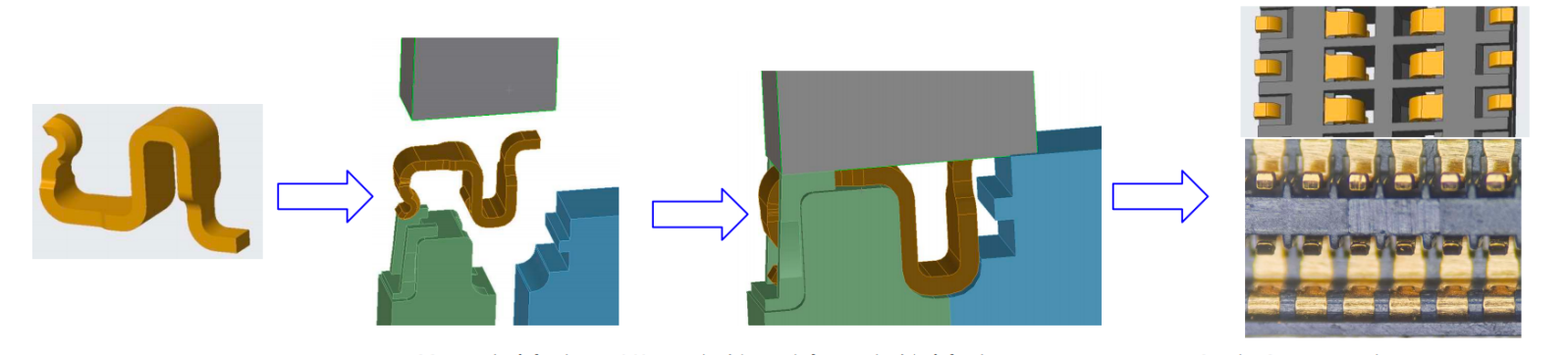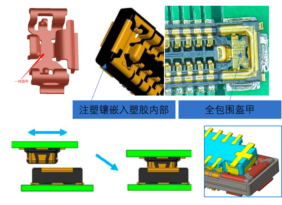 组装地片,导引不足,地片与塑胶结合较差,重复使用水口料。组装端子尺寸不稳定,扣合力不稳定。 | 1.G-Switch产品固定片埋入塑胶中,对产品两端进行全周包裹,且两端拉高后做大导引。2.公母全I/M的端子,端子由模具定位,接触区位置一致 | ||