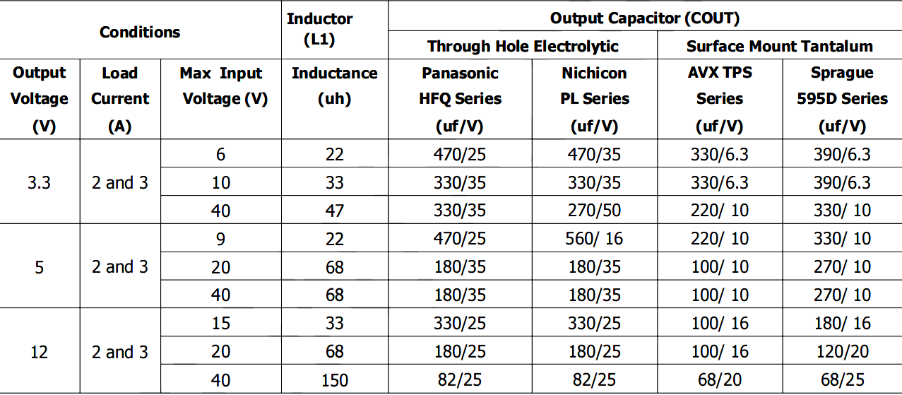 示例:对于3.3V输出,推荐使用330µF/35V(电解电容)或220µF/10V(表面贴装钽电容)。对于其他输出电压电流的取值详细见下图: