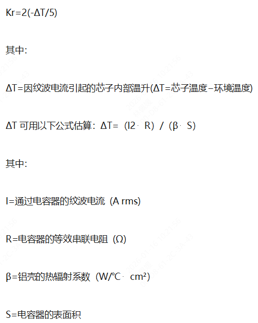 从失效原理上看,铝电解电容器的寿命终结通常被归因于其内部电解液通过橡胶密封塞的缓慢蒸发。正因如此,温度——包括环境温度以及由纹波电流在电容器内部产生的热量——成为影响其寿命最关键的因素。其寿命通常可以通过以下公式进行估算: