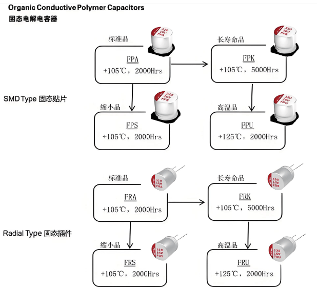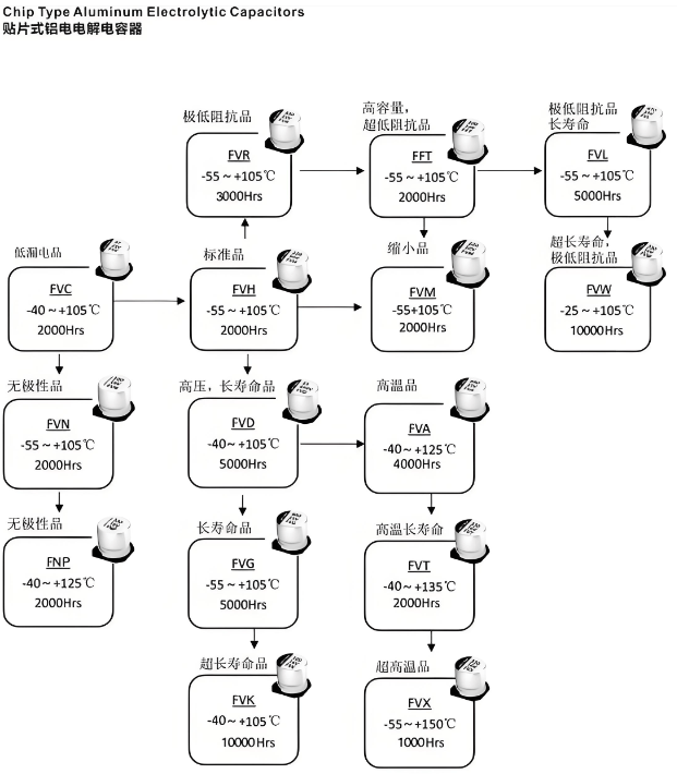 低阻抗长寿命型的FVR极低阻抗品、FFT高容量超低阻抗品、FVL长寿命极低阻抗品、FVD5000小时高压长寿命品、FVG超长寿命品、FVW超长寿命极低阻抗品、FVK超长寿命系列;