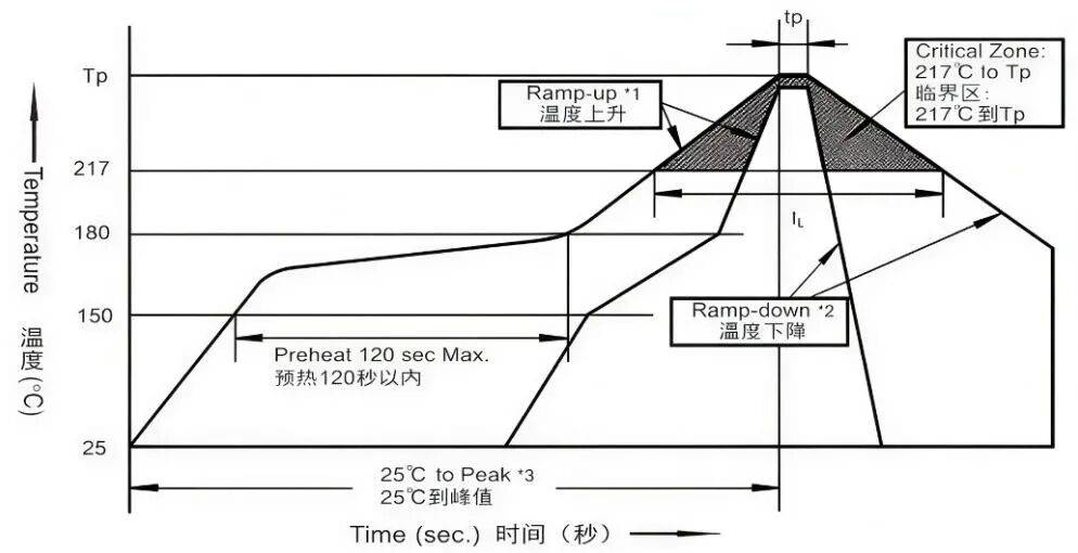 ②电容器顶部温度超过217℃的焊接时间不得超过tL(秒)。
