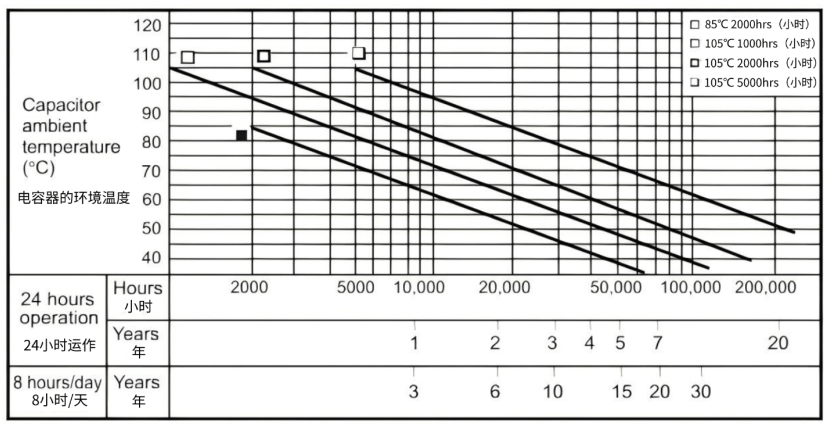 例:对于105℃ 2000 小时的产品,如果在60℃ 环境中连续使用,它的预期寿命约5年。