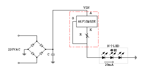 采用高压调节器AKP10M60R,可以非常简便地实现恒定电流以驱动LED。如图5所示,220V市电经过整流滤波后,获得310V的脉动直流电压。再采用高压调节器AKP10M60R和电阻R构成恒流源驱动LED工作。通过调节可变电阻R可以极简便地实现模拟调光,和PWM调光方式相比有效地降低了工作噪声。