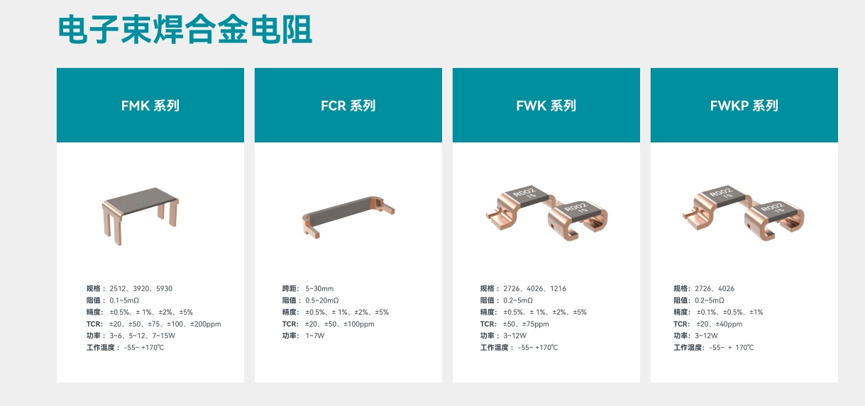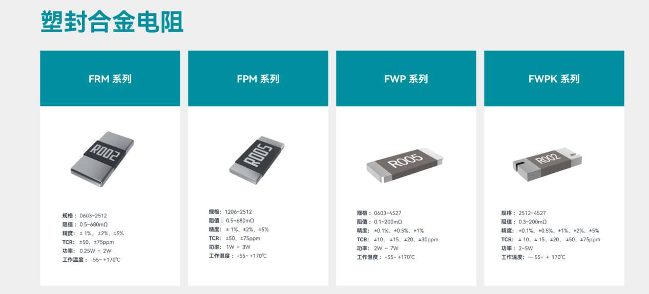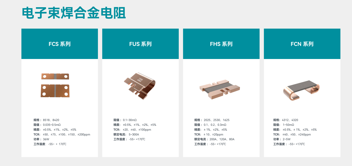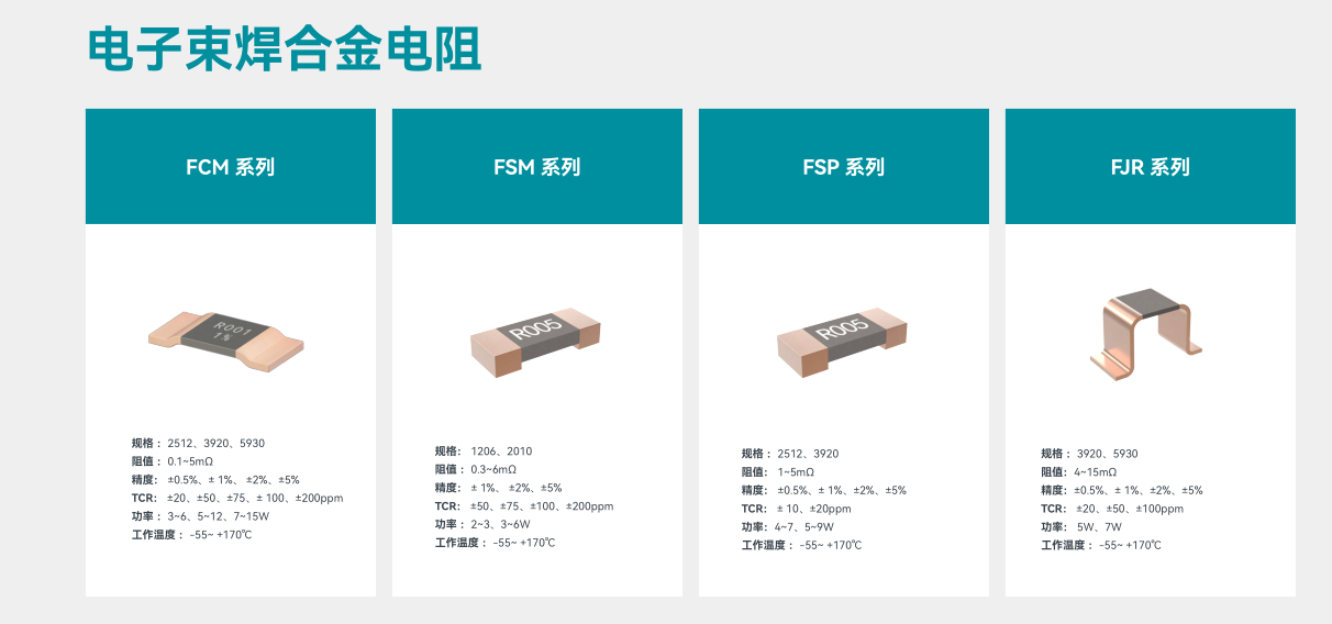 富捷科技以 “高精度、高功率、高可靠性” 为产品核心,构建起覆盖塑封合金电阻、电子束焊合金电阻、FPCS 系列等全品类矩阵: