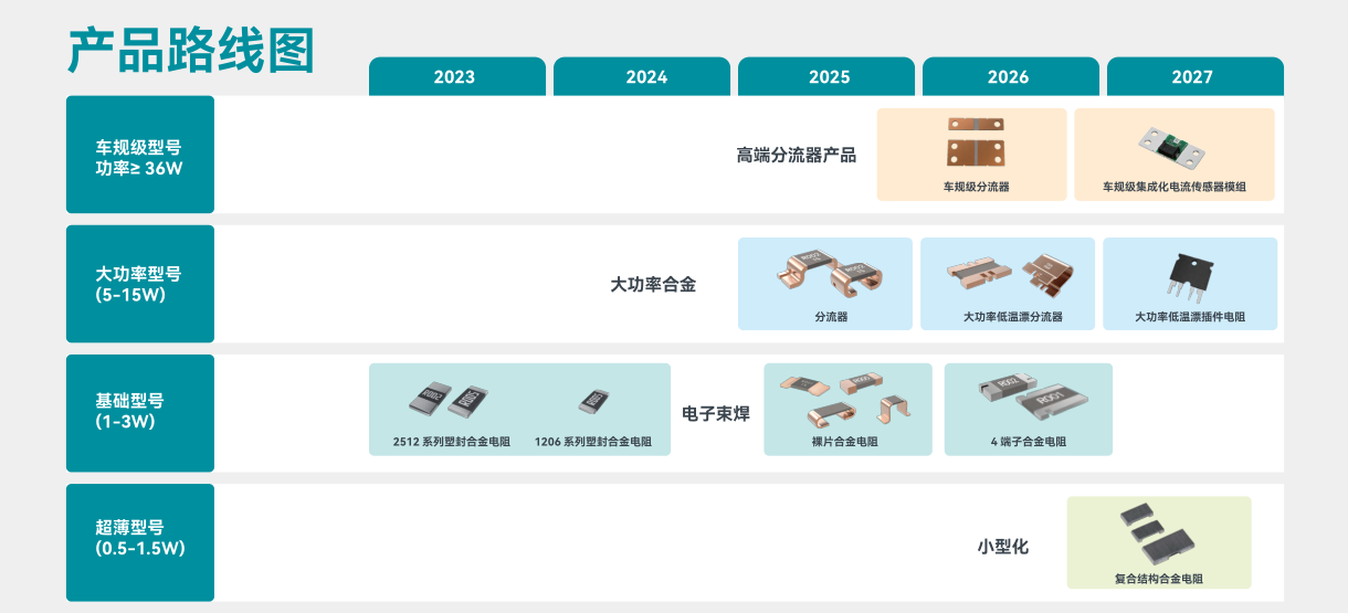 富捷科技计划2025-2027 年将重点突破车规级分流器、集成化电流传感器模组等高端产品,目标功率提升至 36W 以上,同时推进低温漂插件电阻在工业领域的普及。富捷科技集团以 “智能化制造 + 全球化服务” 为双引擎,计划在 2026 年实现全品类电阻数控化率超 90%,进一步缩小与国际巨头的技术差距。这种“材料创新 + 智造升级 + 标准输出”的三维战略,正让富捷科技从高端元件的追赶者,逐步成长为全球电子产业链的 “关键变量”。