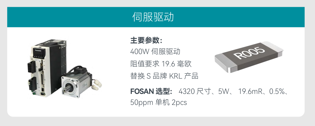 工业控制场景中,富捷电子与国内众多知名头部企业合作多年,其 FWK 系列分流器电阻在400W伺服驱动系统中实现 19.6mΩ 高精度采样,替代了 S 品牌KPL产品;FWP 系列则在变频器中承担母线电流采样任务,凭借 50ppm 的 TCR,保障了工业设备在长时间运行中的参数稳定。
