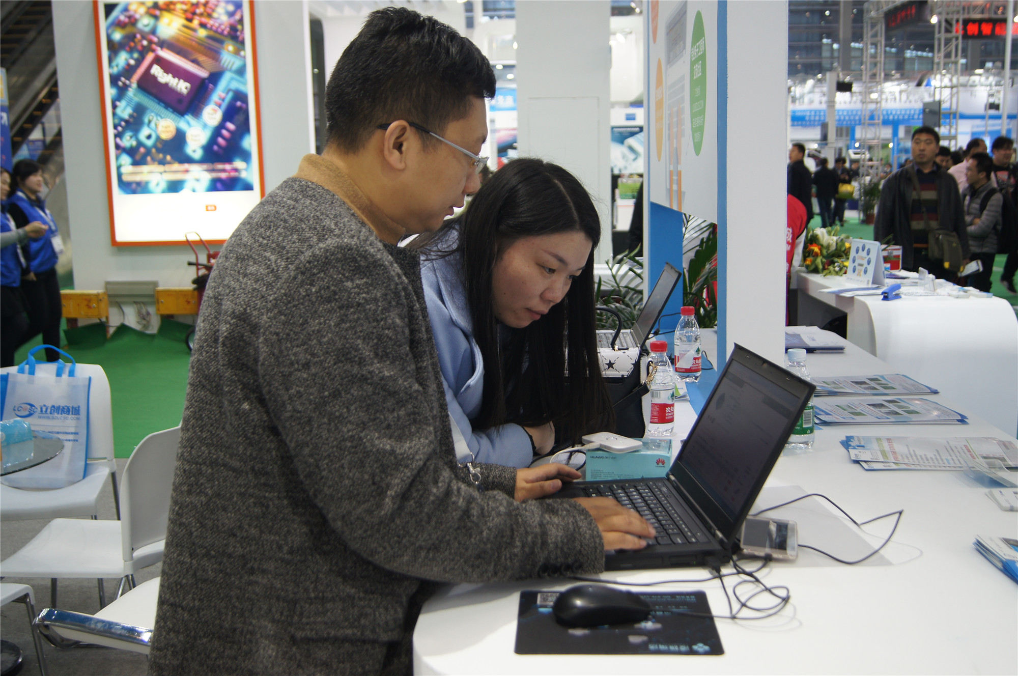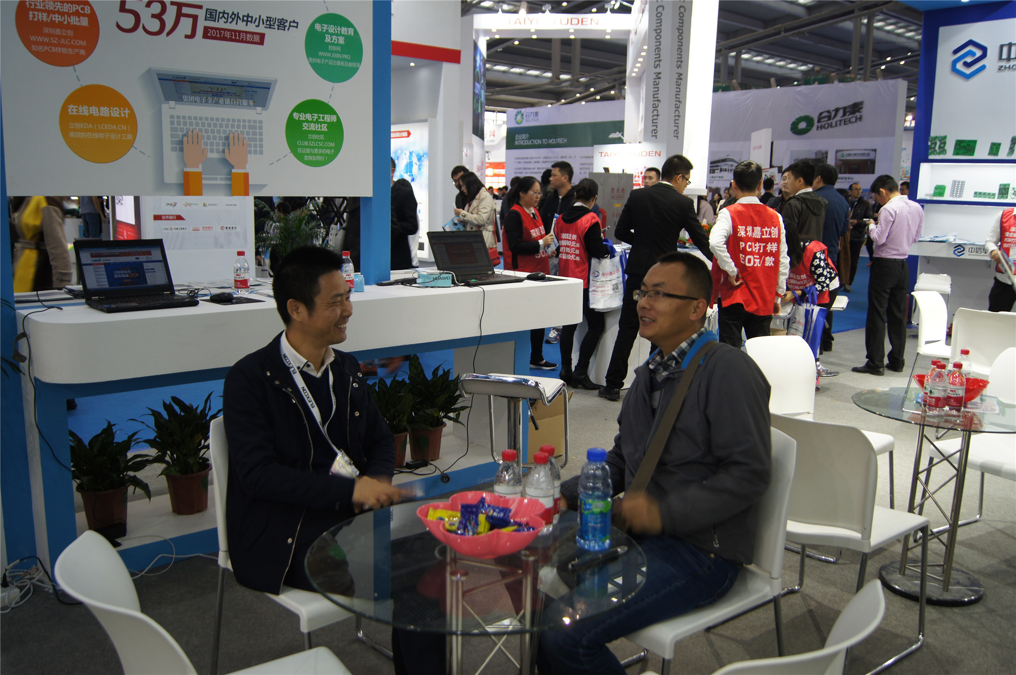一位从事共享充电宝行业的立创商城老客户来到展位,和杨总畅谈电子行业的发展,他说自己也是嘉立创的PCB打板客户。杨总问他在商城下单是否便利,真诚邀请他提出对立创商城的建议和意见。