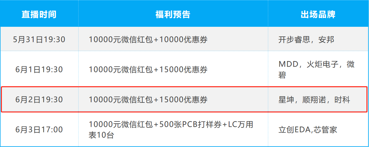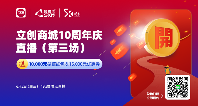 6月2日(周三) 晚19:30,立创携星坤,顺翔诺,时科为您带来周年庆直播第三场,参与直播送10000元红包和15000元优惠券,立即预约!参与立创十周年庆活动,赢10万京东E卡,iPhone 12、50元SMT券等多重豪礼!