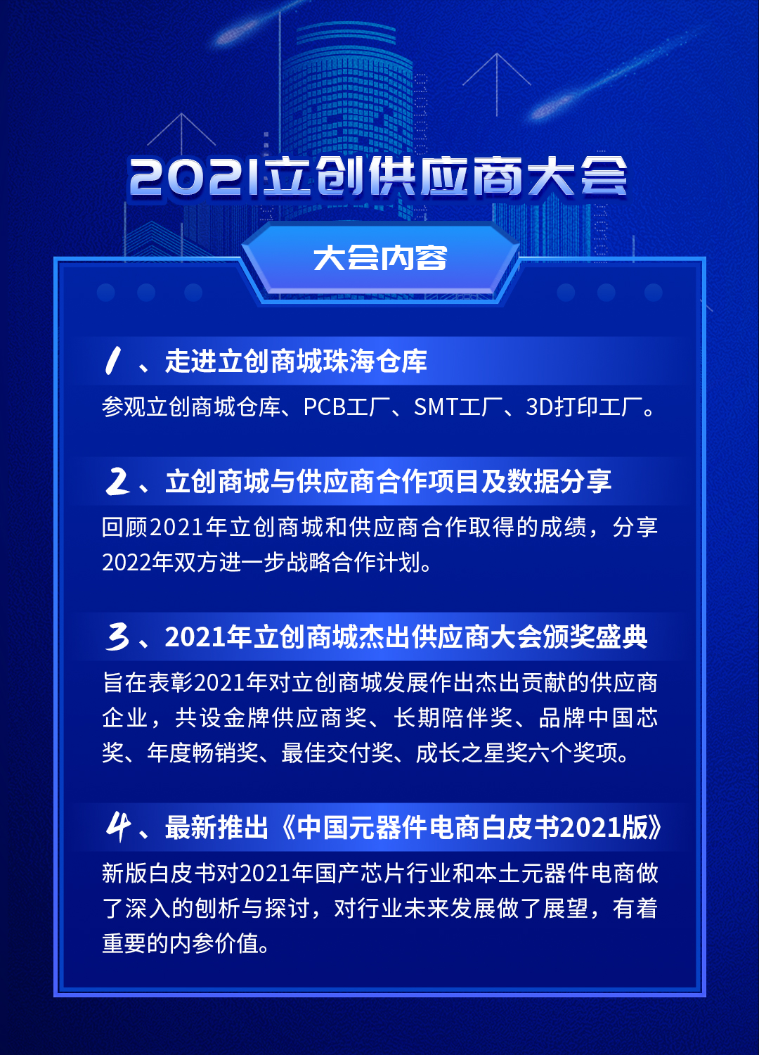1月7日、8日,2021立创供应商大会将隆重召开!两百多家元器件原厂和供应商共聚嘉立创集团珠海基地,元器件智能大仓供众人一饱眼福,还有2021杰出供应商荣誉颁奖盛典盛大开启、《中国元器件电商白皮书(2021版)》最新推出……