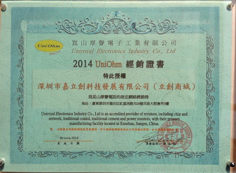 厚声电阻于2014年1月份授权深圳嘉立创(立创商城)为一级代理商,以下为代理证书:
