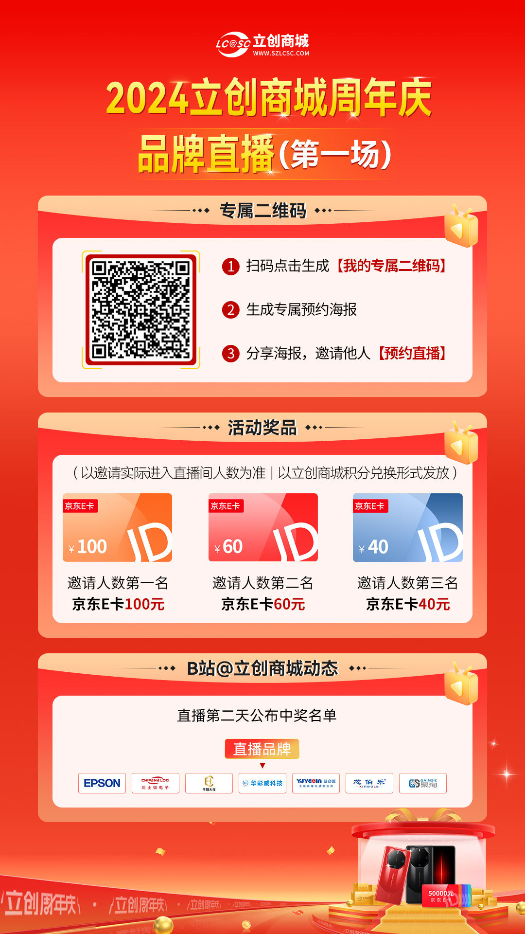 今年立创周年庆巅峰榜,活动期间累计支付商品金额满150万元的前三名客户,就送5万元京东E卡和HUAWEI非凡大师手机。实付满2万元,就有精美好礼可直接领取兑换!