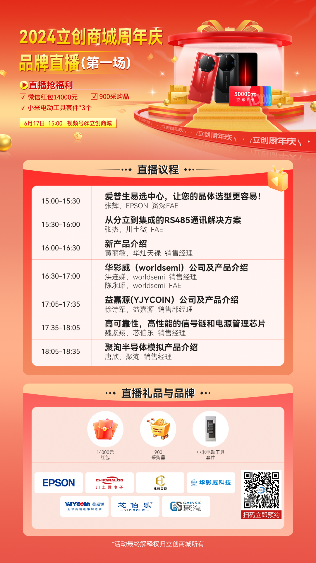 6月17-19日每天15点开始,2024立创商城周年庆品牌直播将在立创商城视频号准时开播,21家品牌供应商将轮番上场,三天直播精彩不断、福利不停!直播中,将涵盖晶振、电源IC、分立器件、模拟芯片、无线模块、连接器、LED灯珠、开关等不同品类的选型指导,还有立创开发板也将在直播中亮相!