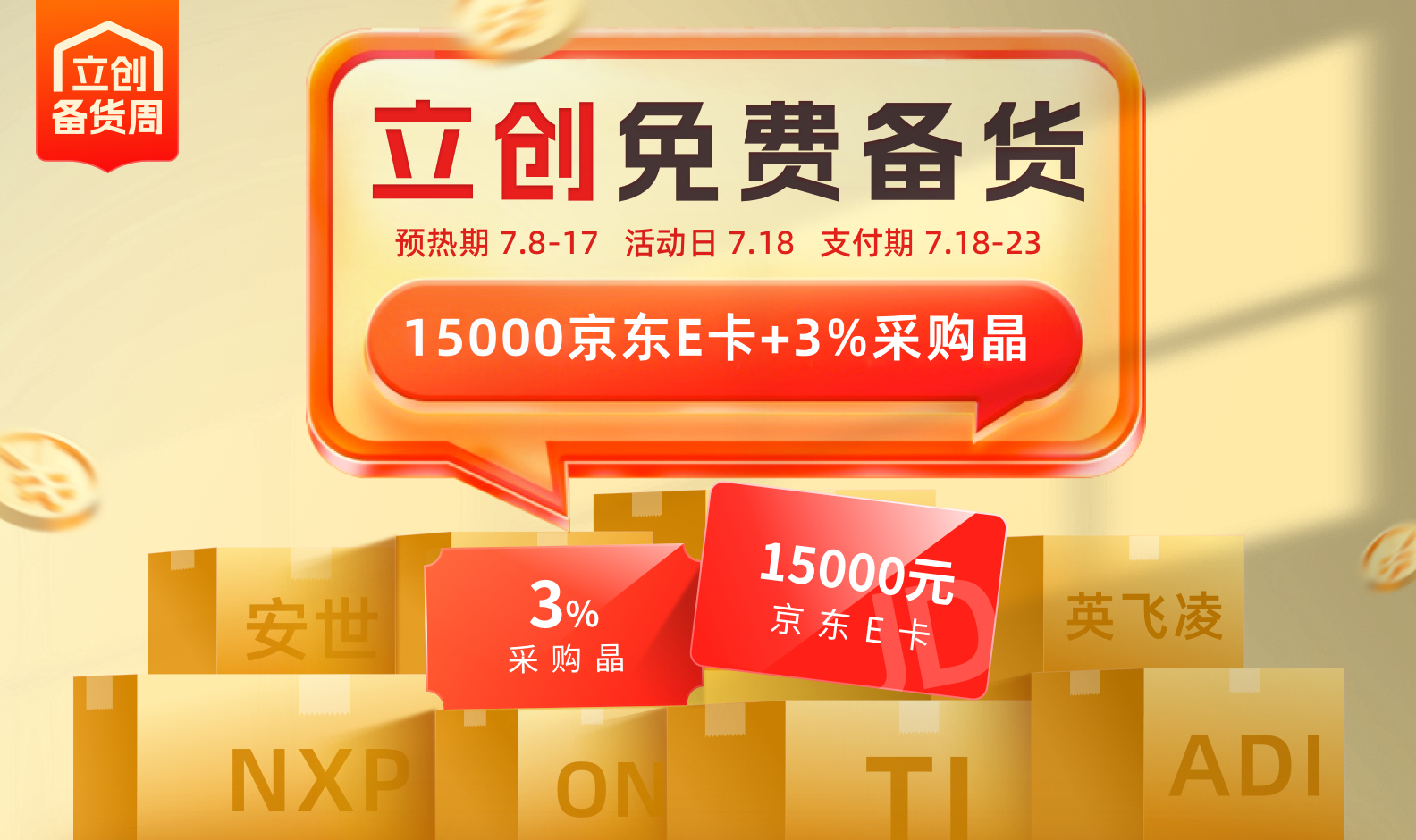 7月立创备货周来袭,下单享返利,京东E卡、采购晶返利齐上阵,最高返15000元京东E卡,快来参与吧!