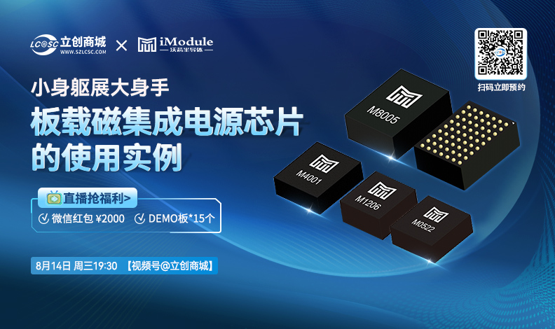 8月14日晚,秉持着让电源设计变得更简单的国产厂商沃芯半导体嘉宾将来到立创商城直播间,在线讲解板载磁集成电源芯片的使用实例,还将送出沃芯产品demo板、微信红包等多重好礼!