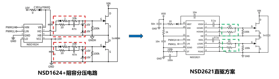 如针对电压型E-mode GaN驱动,纳芯微推出了直驱芯片方案NSD2621,其输出集成LDO可直接驱动GaN,相比传统阻容分压电路设计更简单,且不受工况限制!