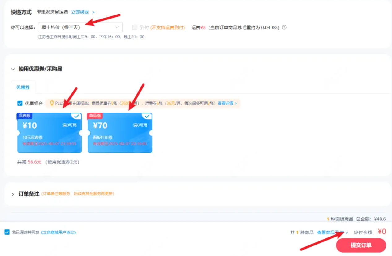 - 带话题#立创面板免费打样,分享设计故事/工艺亮点,按活动页要求提交,经审核后即可发 “优惠券” ;
