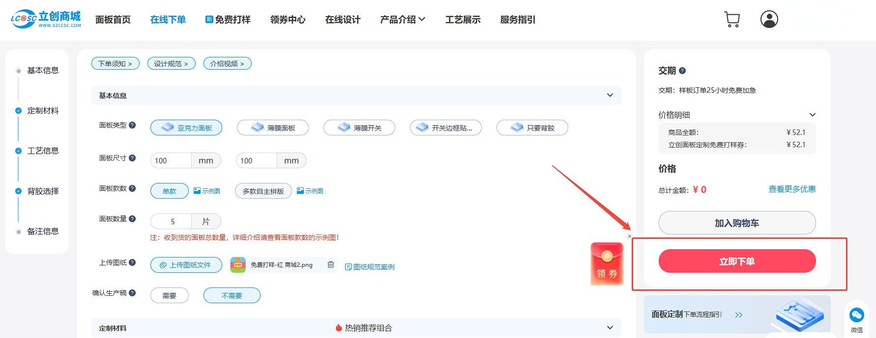 前往立创面板定制官方平台,在首页导航栏中点击进入活动页面,即可领取免费打样券。
