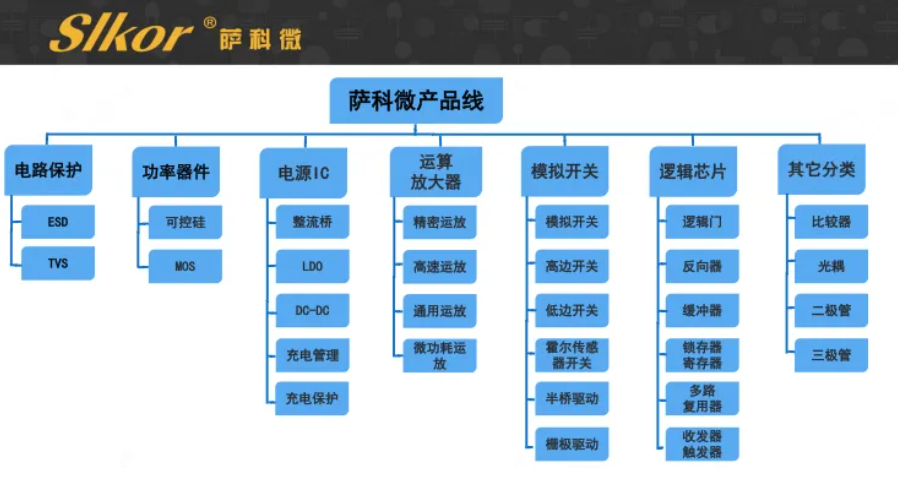 萨科微半导体多年深耕分立电子元器件领域,产品主要包括:电路保护ESD/TVS、功率器件可控硅/MOS、电源IC整流桥/LDO/DC-DC、运放、比较器、模拟开关、逻辑芯片、电平转换芯片以及模数/数模转换器。